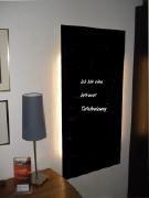 Infrarot Schreibtafelheizung aus schwarzem gesandstrahltem Sicherheitsglas, rahmenlos mit eingerückter Metallrückwand.