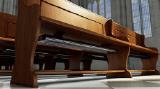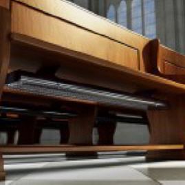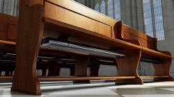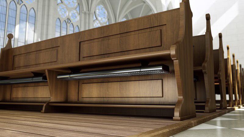 Auch Dank der Anbringung unter dem Sitz sind diese Infrarotheizungen für die Kirchenbesucher bei normalem Blick praktisch unsichtbar.