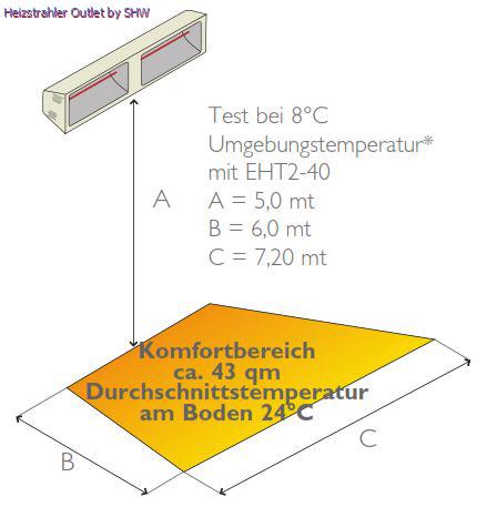 Der Helios Titan ist Testsieger mit Sofortwärme bis auf 5 Meter. Kein anderer Strahler projektiert 20°C auf 43m2 auf 5 m Entfernung. Großer Vorteil der Infrarotstrahler ist, dass einerseits nur beheizt wird wenn effektiv Wärme benötigt wird und andererseits 100% der Wärme sofort nach dem Einschalten des Gerätes spürbar ist.