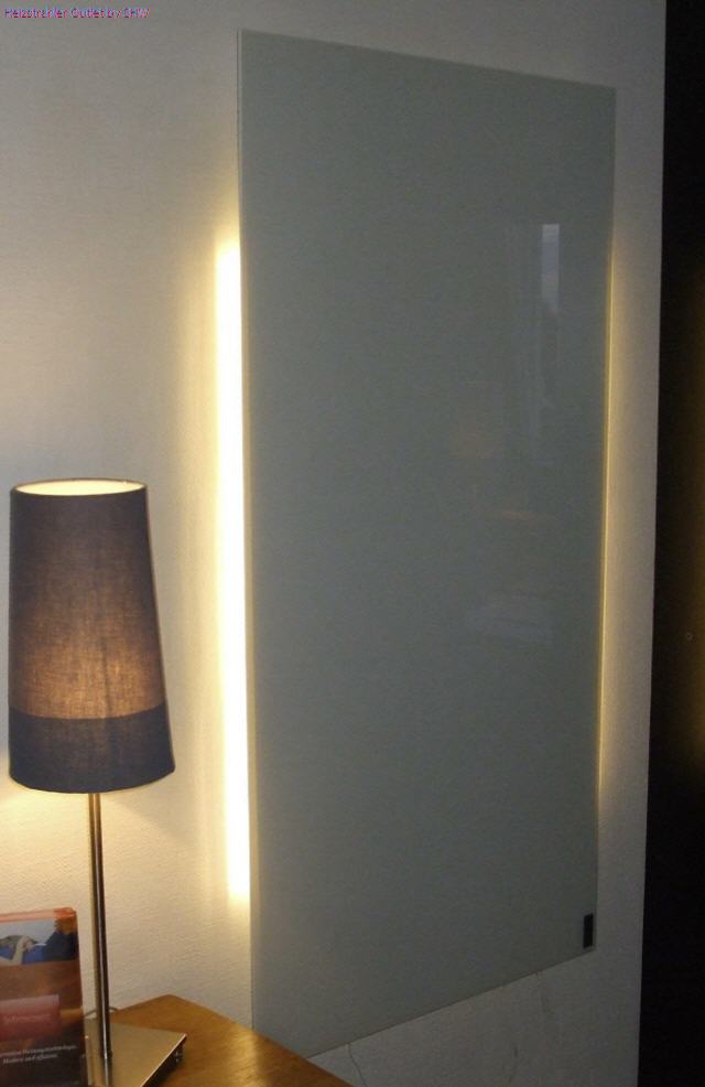 Infrarot Glasheizung mit weißem (RAL 9016 Verkehrsweiß) oder schwarzem (RAL 9017 Verkehrsschwarz) Glas, rahmenlos mit Metallrückwand.