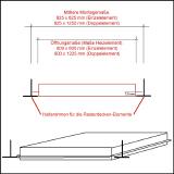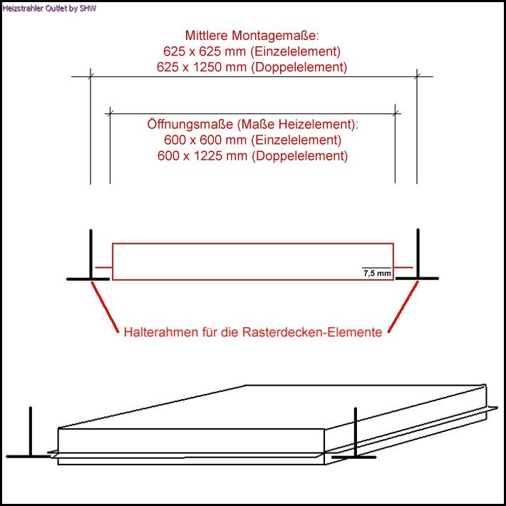 EcoSun E 300 C 625/Vt - Infrarotheizplatte zur Montage in Kassettendecken (Odenwalddecken, Armstrong Ceiling). Rastermaß 62,5 x 62,5 cm, Öffnung 60 x 60 cm. An ihrem Rand befindet sich ein Steg als Auflagefläche in dem Deckenraster.