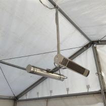 Die Befestigung an der Zeltstange erfolgt über eine Kletthalterung und wird zusätzlich durch ein Sicherheitsseil gesichert. Die Heizstrahler werden einfach mit den mitgelieferten Bügeln/Brackets (L-Bracket) am unteren Teil der Zeltstange befestigt, bzw. geschraubt