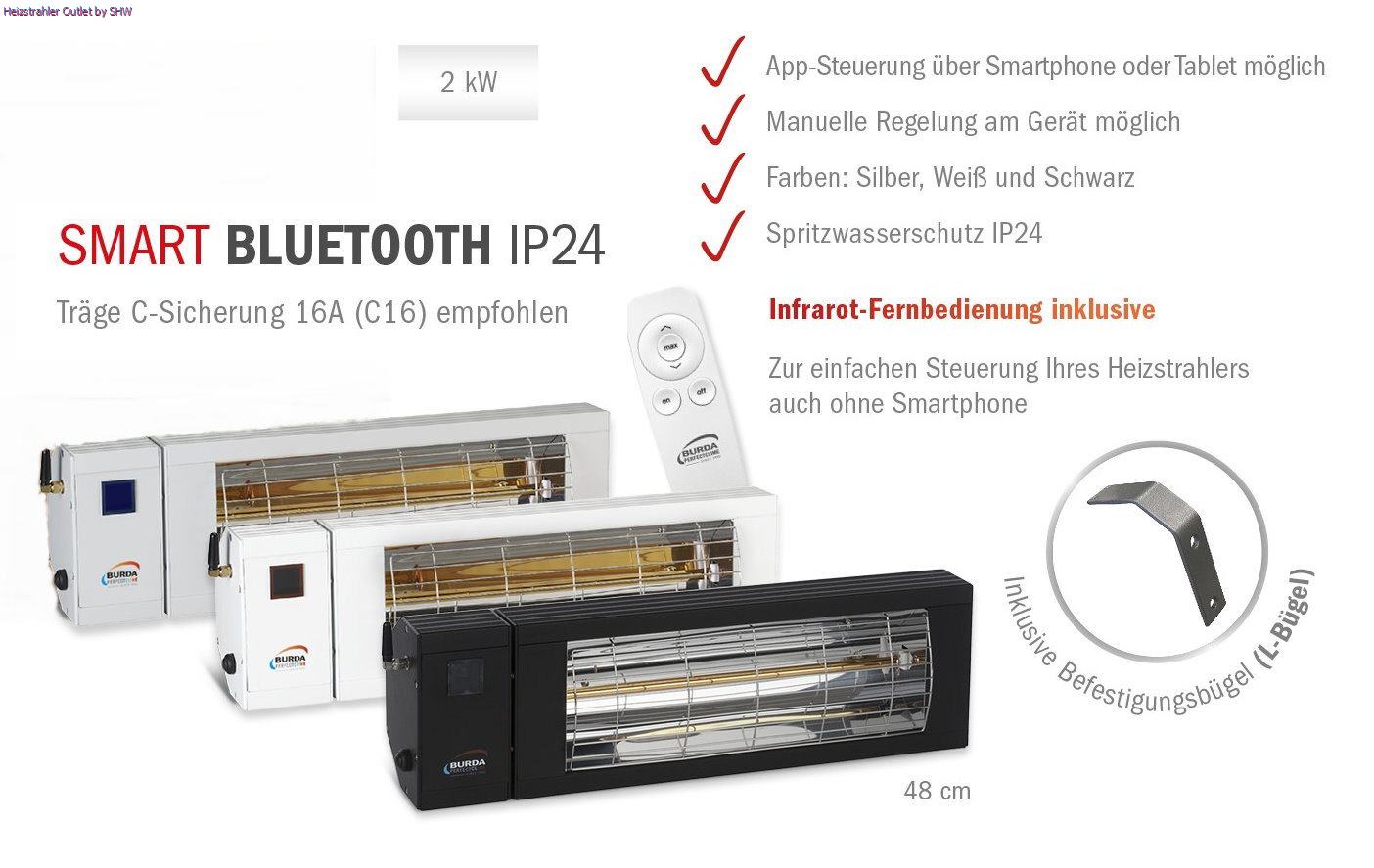 Der kompakte Heizstrahler SMART IP24 mit Bluetooth Schnittstelle lässt sich unkompliziert und kabellos mit der kostenlosen BURDA APP über das Smartphone oder Tablet (iOS, Android) steuern.